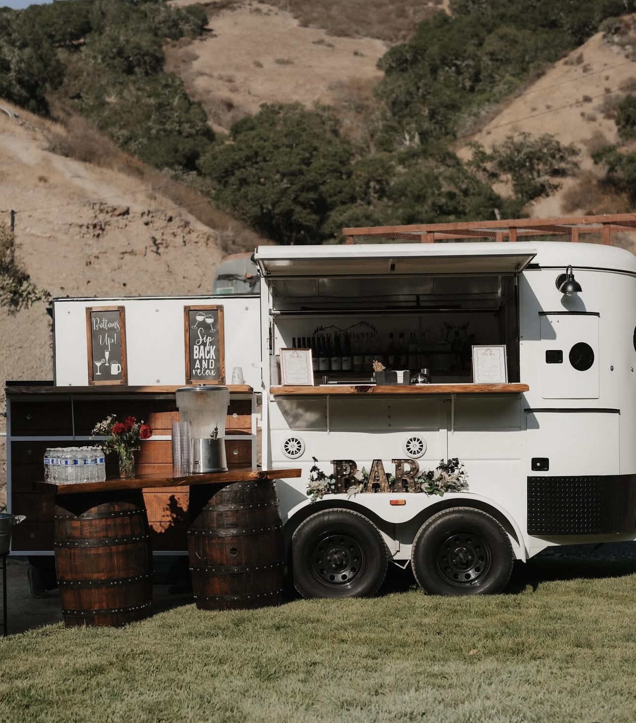 Our signature rustic showpiece with warm lighting, a large serving window, and a handcrafted wood bar. Perfect for outdoor weddings, ranch venues, and vineyard settings.