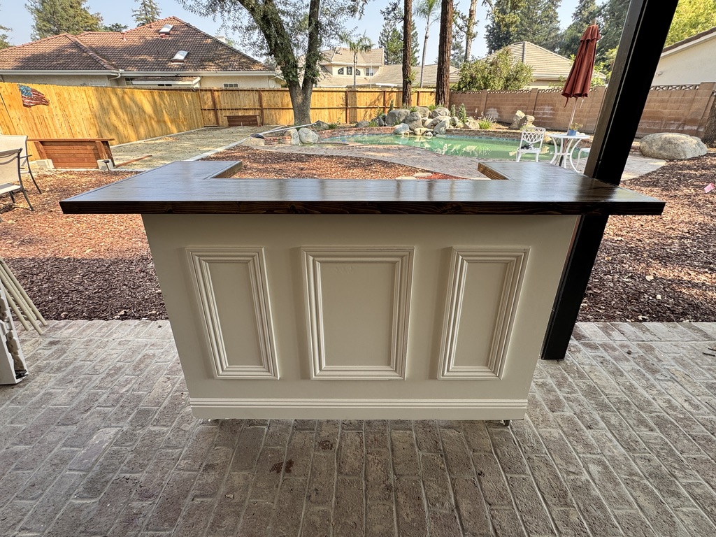 A timeless, elegant bar with clean ivory paneling and a rich oak top — perfect for upscale venues and classic wedding styles.